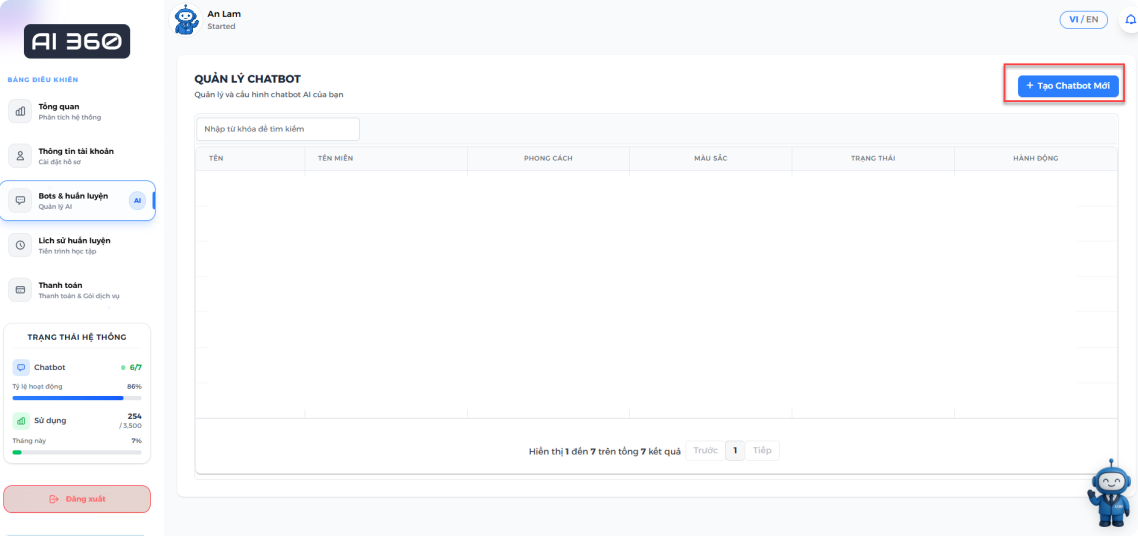 Hoặc ở trang "Bot & huấn luyện", bạn có thể nhấn vào nút "Tạo chatbot mới" để bắt đầu tạo chatbot của mình.