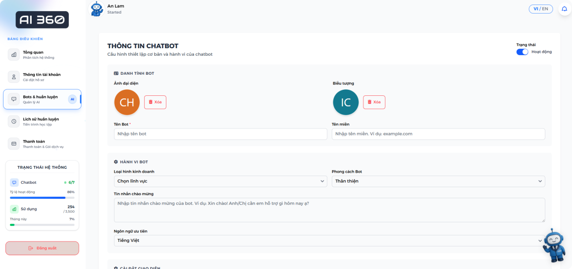 Nhấn vào nút "Tạo chatbot mới" trên trang "Thông tin tài khoản" để bắt đầu tạo chatbot của bạn.