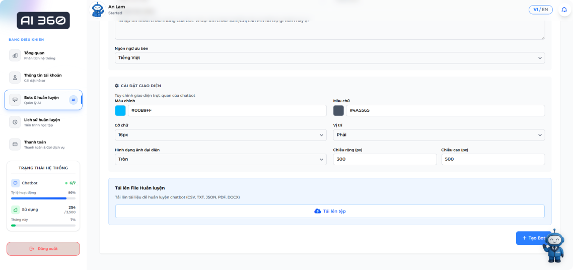 Trên trang tạo chatbot, bạn có thể tuỳ chỉnh các thông tin như tên chatbot, màu chính, màu chữ, .... Bạn cũng có thể tải lên tệp dữ liệu để huấn luyện chatbot.