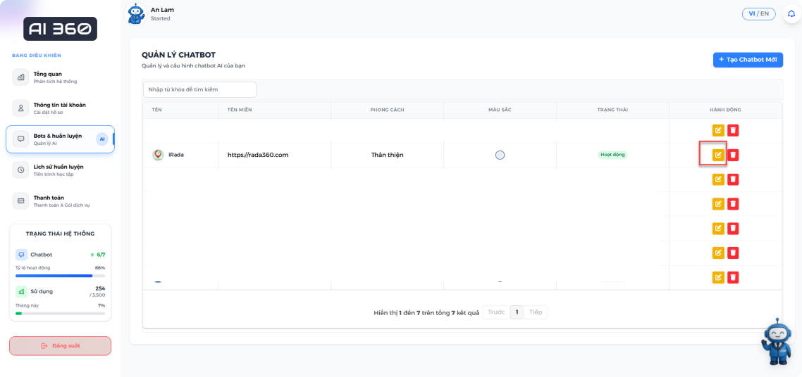 Sau khi tạo chatbot, bạn có thể tìm thấy chúng ở mục "Bots & Huấn luyện". Bạn có thể nhấn vào nút "Chỉnh sửa" để chỉnh sửa chatbot của mình.