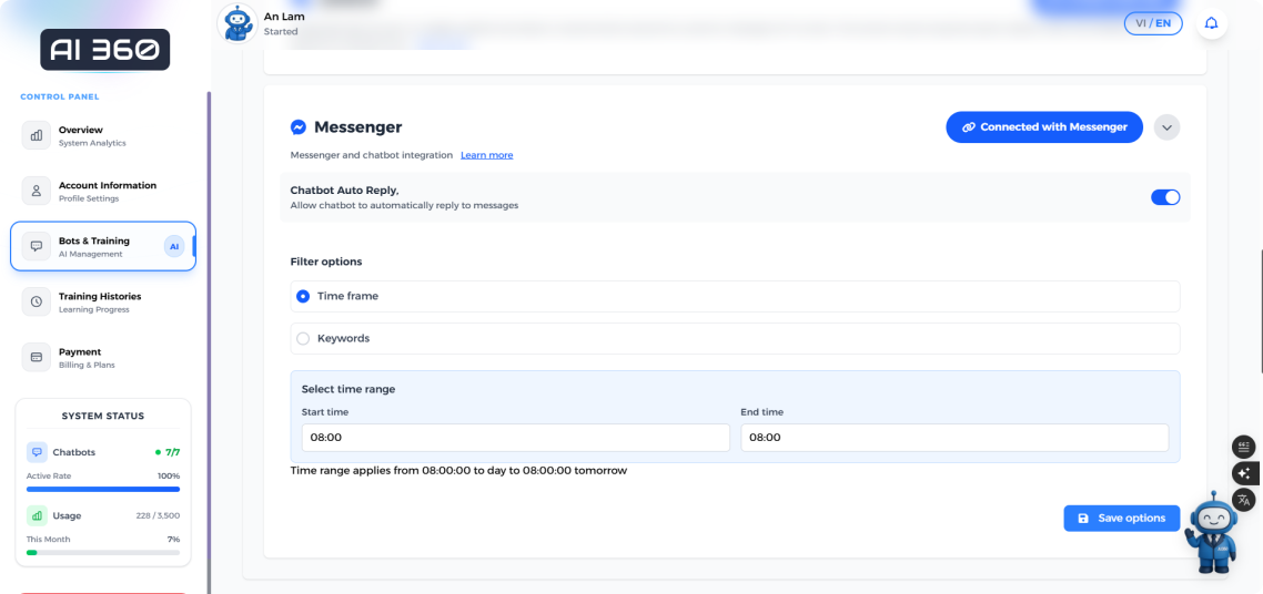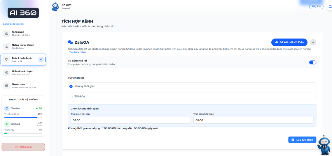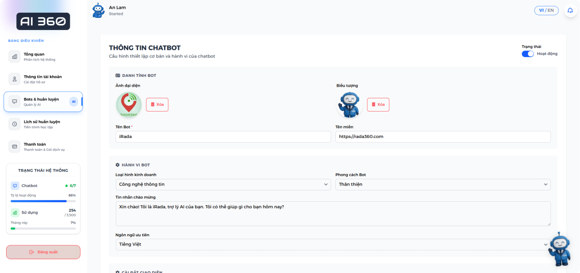 - AI dễ huấn luyện: Cập nhật và huấn luyện đơn giản với tài liệu, sản phẩm, FAQ của bạn — không cần lập trình, không cần code. Bạn chỉ cần "dạy" AI bằng ngôn ngữ tự nhiên, AI lo phần còn lại.