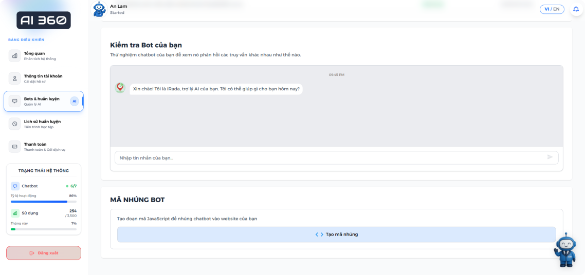 Sau khi đã hoàn tất việc tuỳ chỉnh, bạn có thể nhấn nút "Tạo Bot" để tạo chatbot của mình.