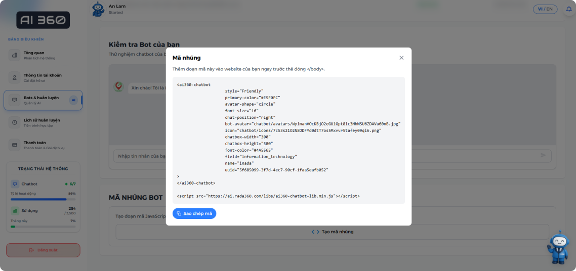Sau khi cửa sổ chứa mã nhúng xuất hiện, bạn có thể sao chép mã đã tạo và dán vào trang web của mình. Mã này sẽ tích hợp chatbot vào trang web của bạn.