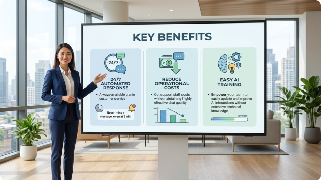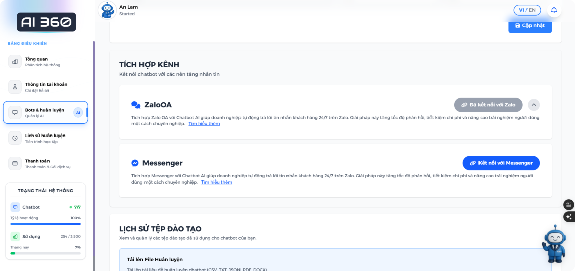 - AI tự huấn luyện: Dễ dàng cập nhật và huấn luyện bot với tài liệu, sản phẩm, FAQ của bạn — không cần viết code.