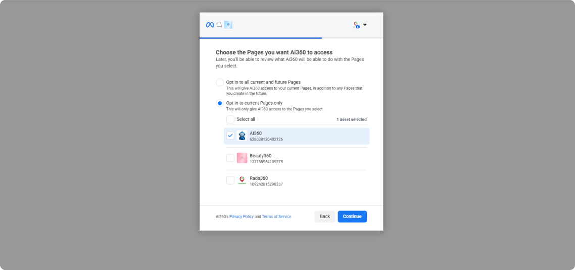 Trình duyệt sẽ chuyển hướng đến màn hình Facebook yêu cầu quyền truy cập Facebook Page. Chọn Facebook Page của bạn từ danh sách → Kiểm tra tất cả các quyền cần thiết để tích hợp Messenger → Nhấp "Continue" để tiếp tục thiết lập.