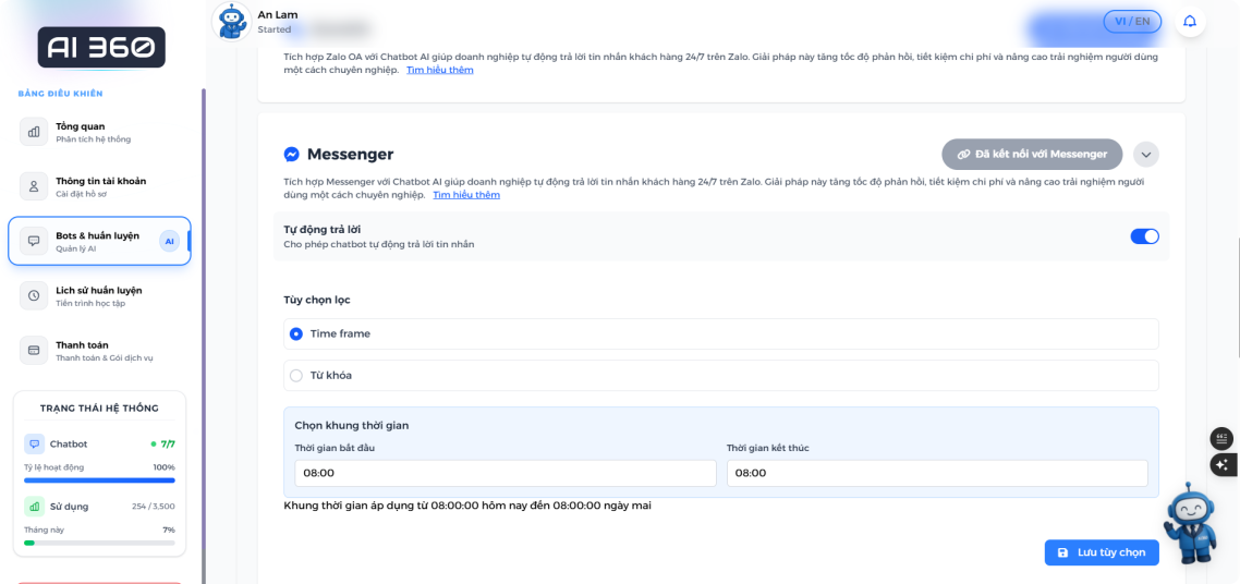 Sau khi cấp quyền thành công, quay lại AI360 để cấu hình cài đặt trả lời tự động Messenger của bạn. Chọn kích hoạt "Khung thời gian" hoặc "Từ khóa" theo nhu cầu → Thiết lập tin nhắn chào mừng và trả lời nhanh → Nhấn "Lưu tùy chọn" để hoàn tất thiết lập.